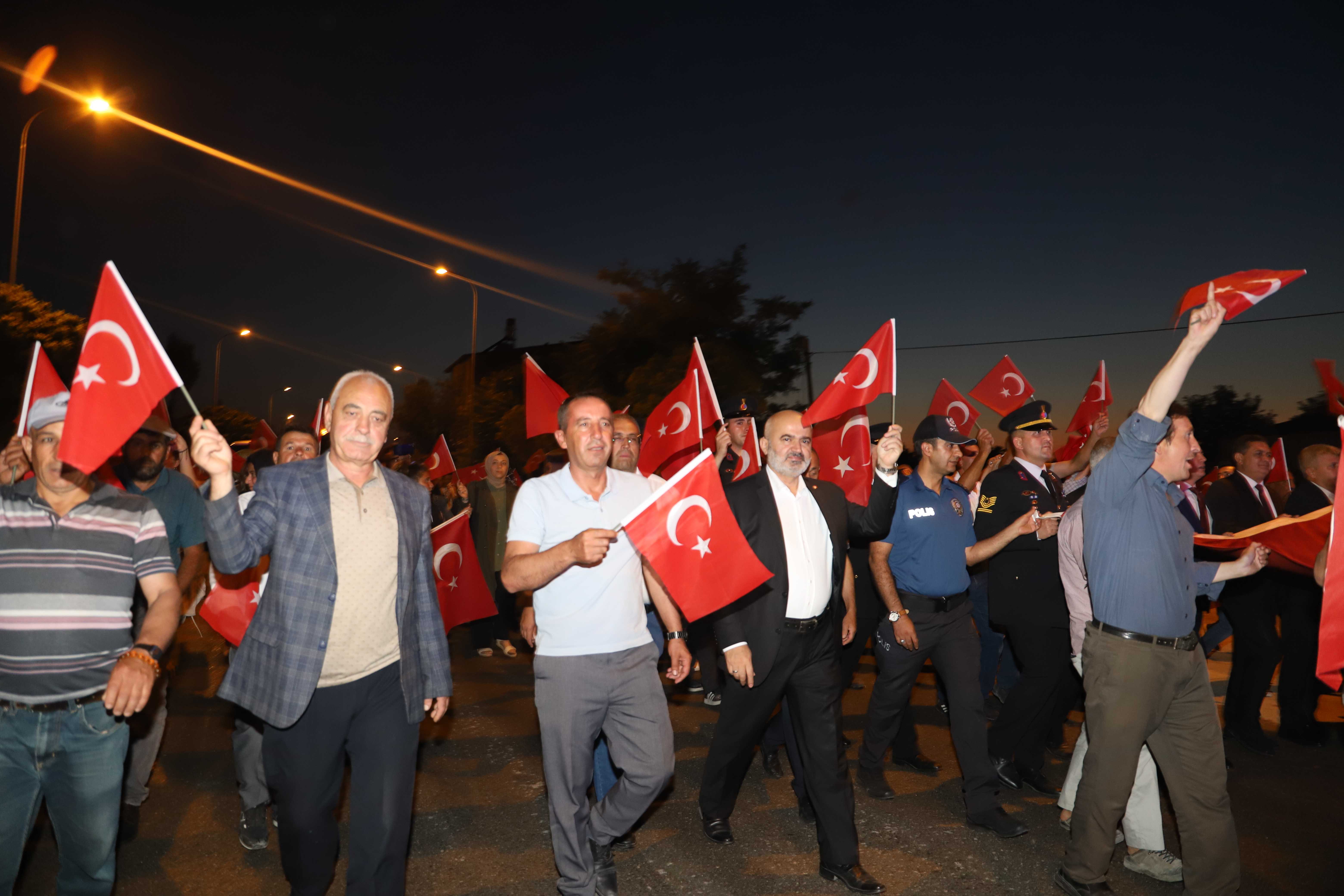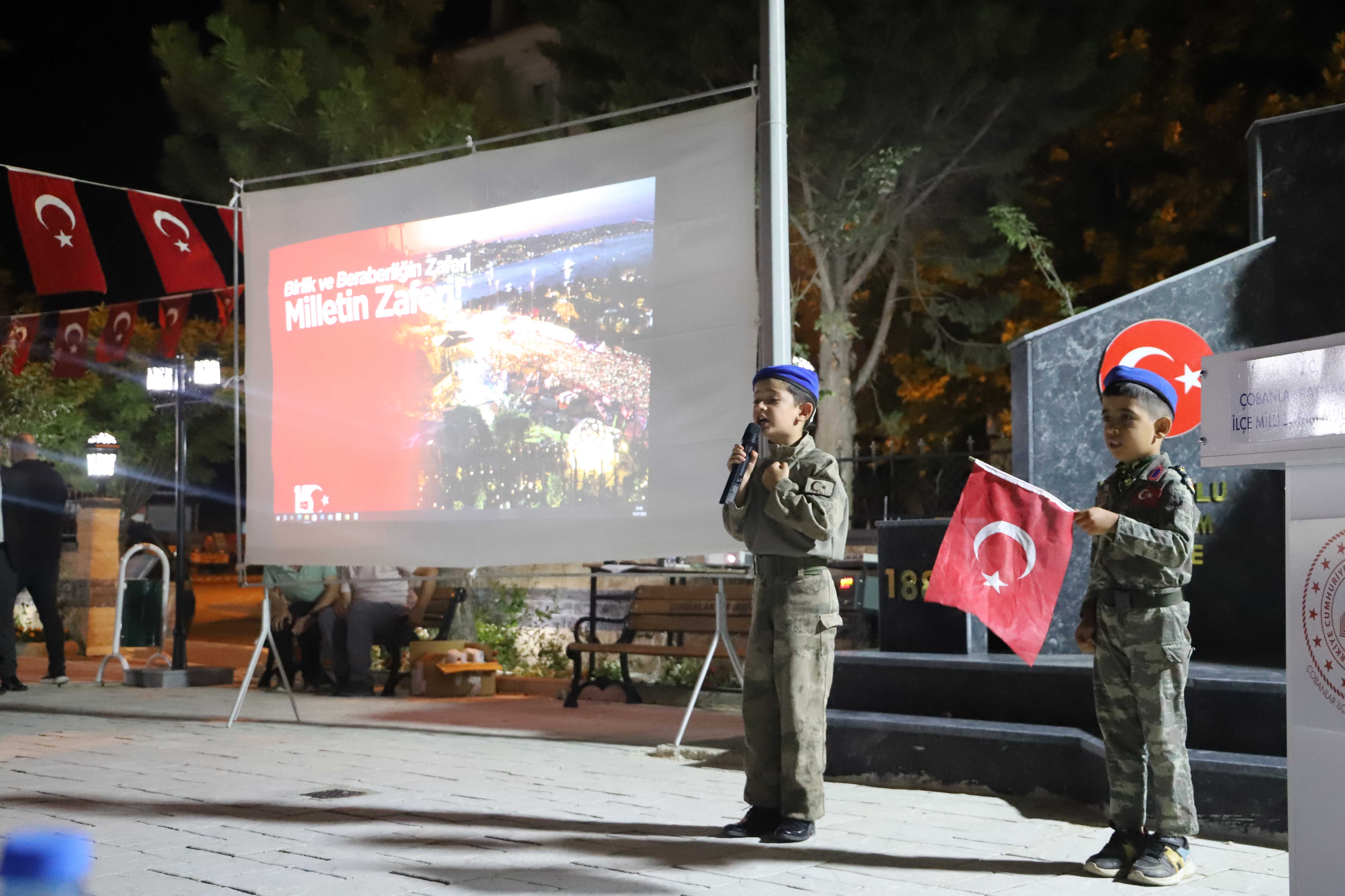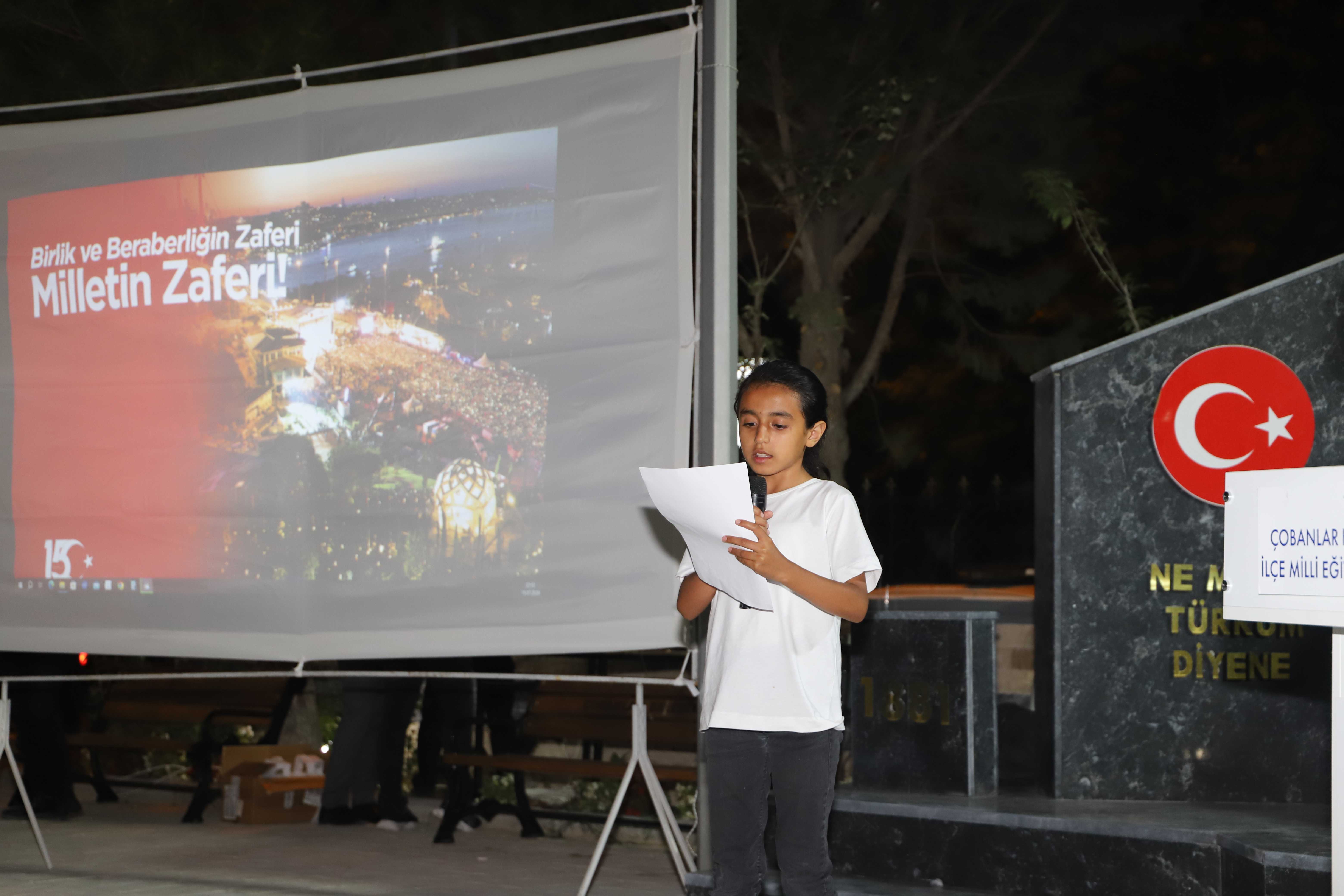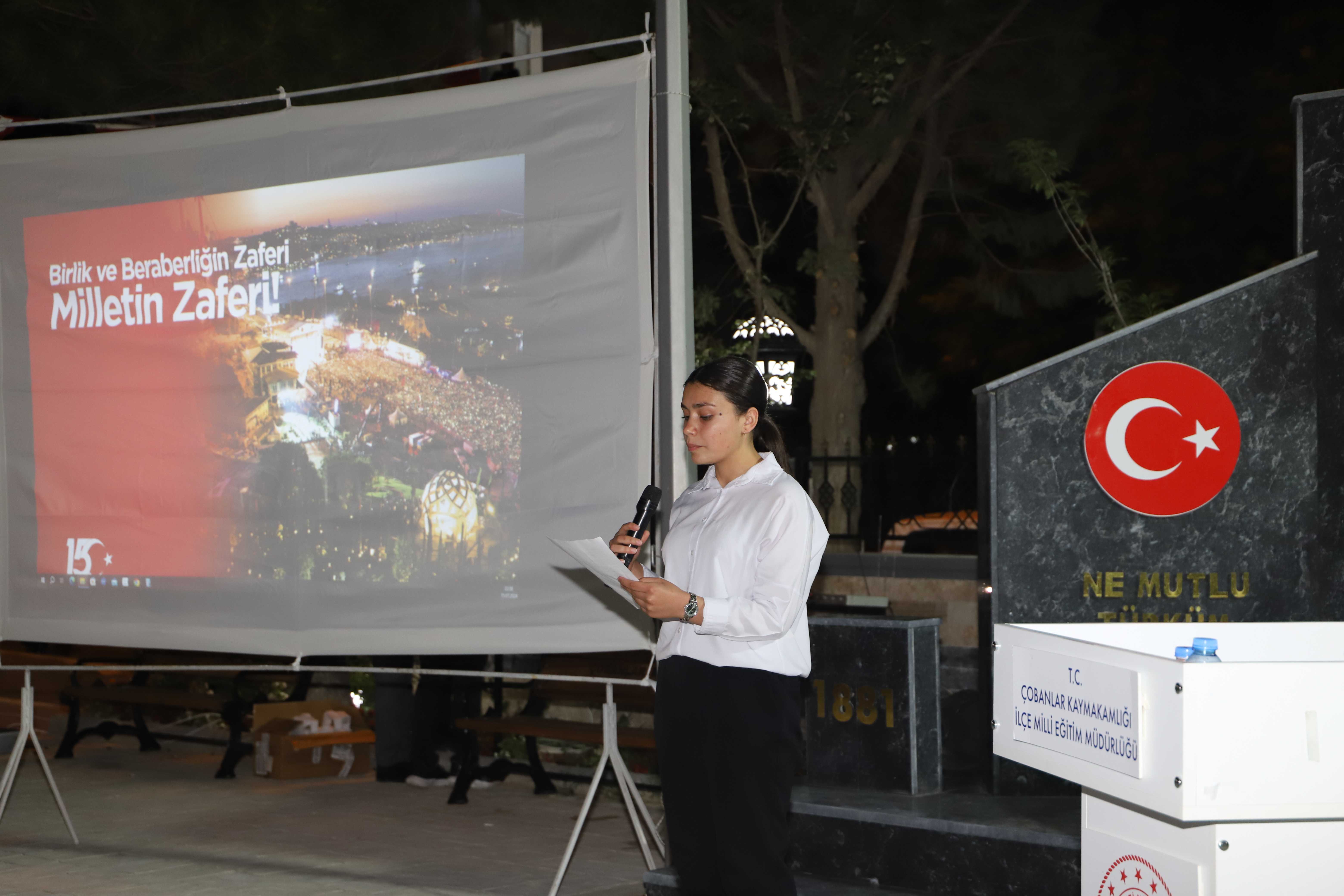 ihanete karşı tek yürek olan necip milletimizin cesaretiyle yazılan 15 Temmuz destanının 8. yıl dönümü münasebetiyle Cumhuriyet Meydanında düzenlenen programa İlçe Kaymakamı Sedat Akpınar, Belediye Başkanı Ali Altuntaş, ilçe protokolü, şehit aileleri, gaziler ve çok sayıda vatandaşın katılımı ile aziz milletimizin asil kahramanları şehit ve gazilerimiz bir kez daha dualarla anıldı.